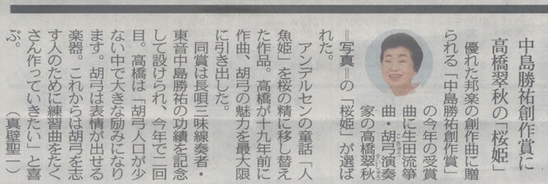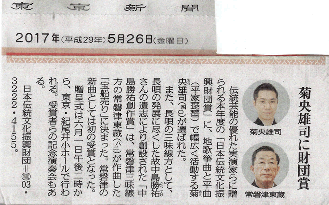 第六回中島勝祐創作賞受賞の記事が 2017年5月26日の東京新聞に掲載されました。