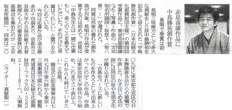 第四回中島勝祐創作賞受賞の記事が 2015年6月26日の東京新聞に掲載されました。