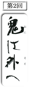 そして自分が鬼であることを忘れ、若妻に言寄るのですが、逆に、その若妻に鬼の宝物を取り上げられ、その上.「福は内」「鬼は外」へと豆を撒いて追い帰されてしまうのが原作ですが、私の妻が「ひで貴先生は、女性ですから女鬼にして、若婁を美青年にしては」と冗談まじりに話した事が切っ掛けとなり、男女が入れ変って出来上りました。 台本は狂言風ですので、台詞を多くして解りやすくと考え、又、コミカルな題材で女の可愛らしさと奥に潜む業の様なものを表現しようと思いました。 |